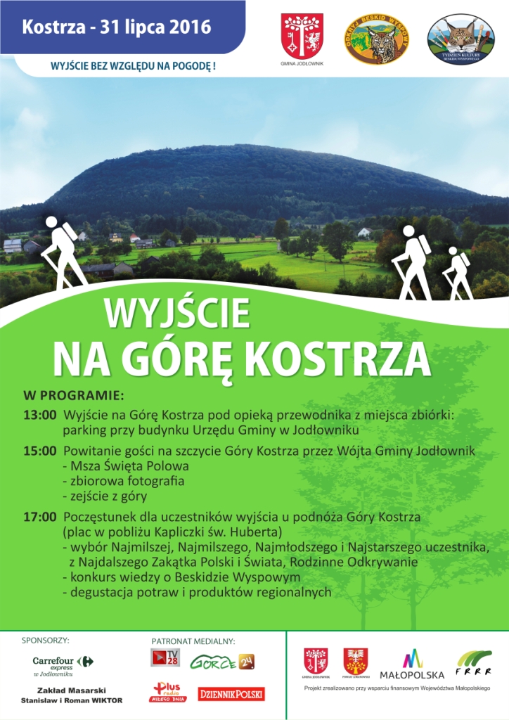 W związku z Mszą Świętą Posłania na zakończenie Światowych Dni Młodzieży, która zostanie odprawiana przez Papieża Franciszka w dniu 31 lipca 2016 roku o godz. 10.00 w Campusie Misericordiae w Brzegach, Wójt Gminy Jodłownik informuje, że Msza Święta Polowa na Górze Kostrza w ramach akcji Odkryj Beskid Wyspowy zostanie odprawiona o godz. 15.00 (przełożona z godz. 11.00).