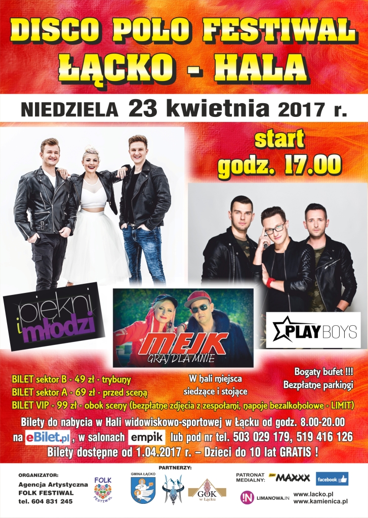 Agencja Artystyczna FOLK FESTIWAL zaprasza na DISCO POLO FESTIWAL, podczas którego wystąpią topowe gwiazdy muzyki DISCO POLO - Piękni i Młodzi, Playboys oraz zespół Mejk. Impreza odbędzie się w niedzielę 23 kwietnia 2017 r. w Hali Widowiskowo - Sportowej w Łącku. Początek o godzinie 17.00.
