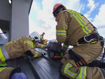 - poszkodowana osoba znajdująca się na dachu budynku, która straciła przytomność podczas prac związanych z malowaniem pokrycia dachowego.