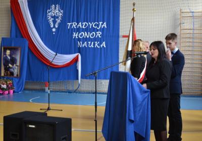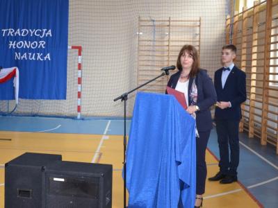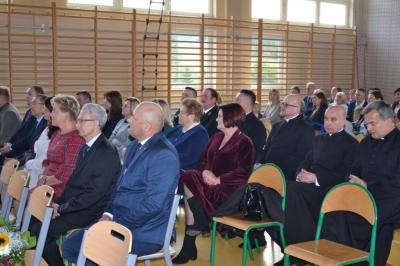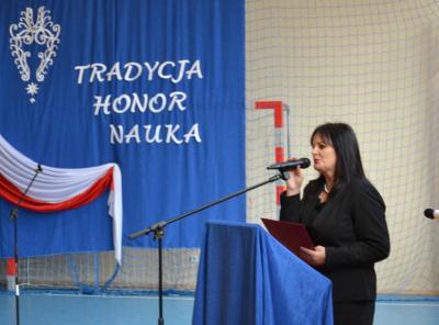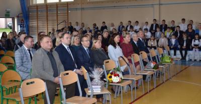 Po odśpiewaniu hymnu narodowego, pani Dyrektor serdecznie powitała zaproszonych gości: Wójta Gminy Kamienica – Władysława Sadowskiego, Wicestarostę Powiatu Limanowskiego – Agatę Ziębę, radnych gminy, dyrektorów szkół, Pełnomocnika ds. Profilaktyki i Rozwiązywania Problemów Alkoholowych w Gminie Kamienica – Panią Zofię Kuchnię, przedstawicieli OSP, KGW, nauczycieli, rodziców oraz uczniów. Dyrektor szkoły podkreśliła, ze w życiu różnych społeczności bywają takie momenty, które na długo pozostają w sercach i taka chwila staje się dziś naszym udziałem.