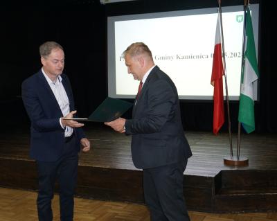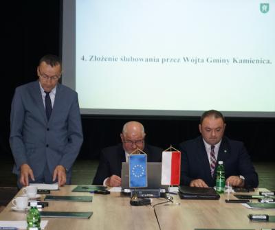 Na początku obrad głos zabrał Przewodniczący Gminnej Komisji Wyborczej w Kamienicy – Jarosław Augustyniak, który dokonał wręczenia zaświadczeń o wyborze na radnego oraz zaświadczenia o wyborze na Wójta Gminy Kamienica. Następnie radni i wójt Władysław Sadowski złożyli ślubowanie.