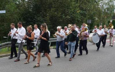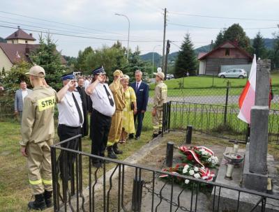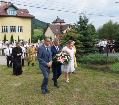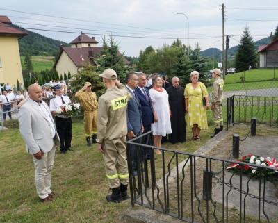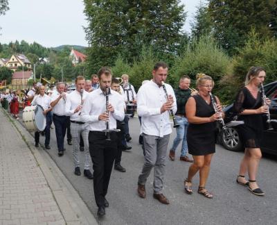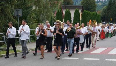 Po nabożeństwie barwny dożynkowy korowód, przy akompaniamencie Orkiestry Dętej, przemaszerował na plac przy budynku Ochotniczej Straży Pożarnej, gdzie miała miejsce dalsza część rolniczego święta. Po drodze nie zabrakło akcentu patriotycznego – starosta, wójt oraz radni i strażacy z Zalesia złożyli symboliczną wiązankę kwiatów pod pomnikiem poległych w II wojnie światowej.