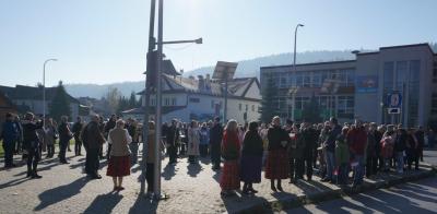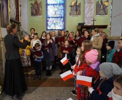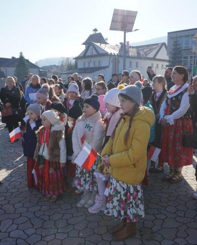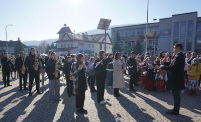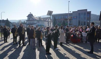 Na koniec patriotycznego spotkania na płycie kamienickiego rynku odbyło się wspólne odśpiewanie pieśni patriotycznych przy akompaniamencie Gminnej Orkiestry Dętej i dzieci z grupy folklorystycznej działającej przy GOKSiR w Kamienicy.
