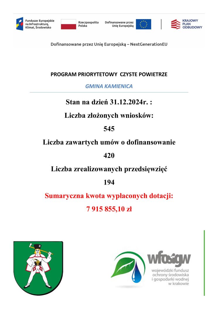 Obsługa wniosków oraz dopłaty na wymianę kopciucha i termomodernizację domów realizowane są nieprzerwanie. Jednocześnie 12 grudnia, rozpocznie się przyjmowanie wniosków w ramach programu „Czyste Powietrze” na terenach dotkniętych powodzią. Nowym program powróci 31 marca 2025 r.
